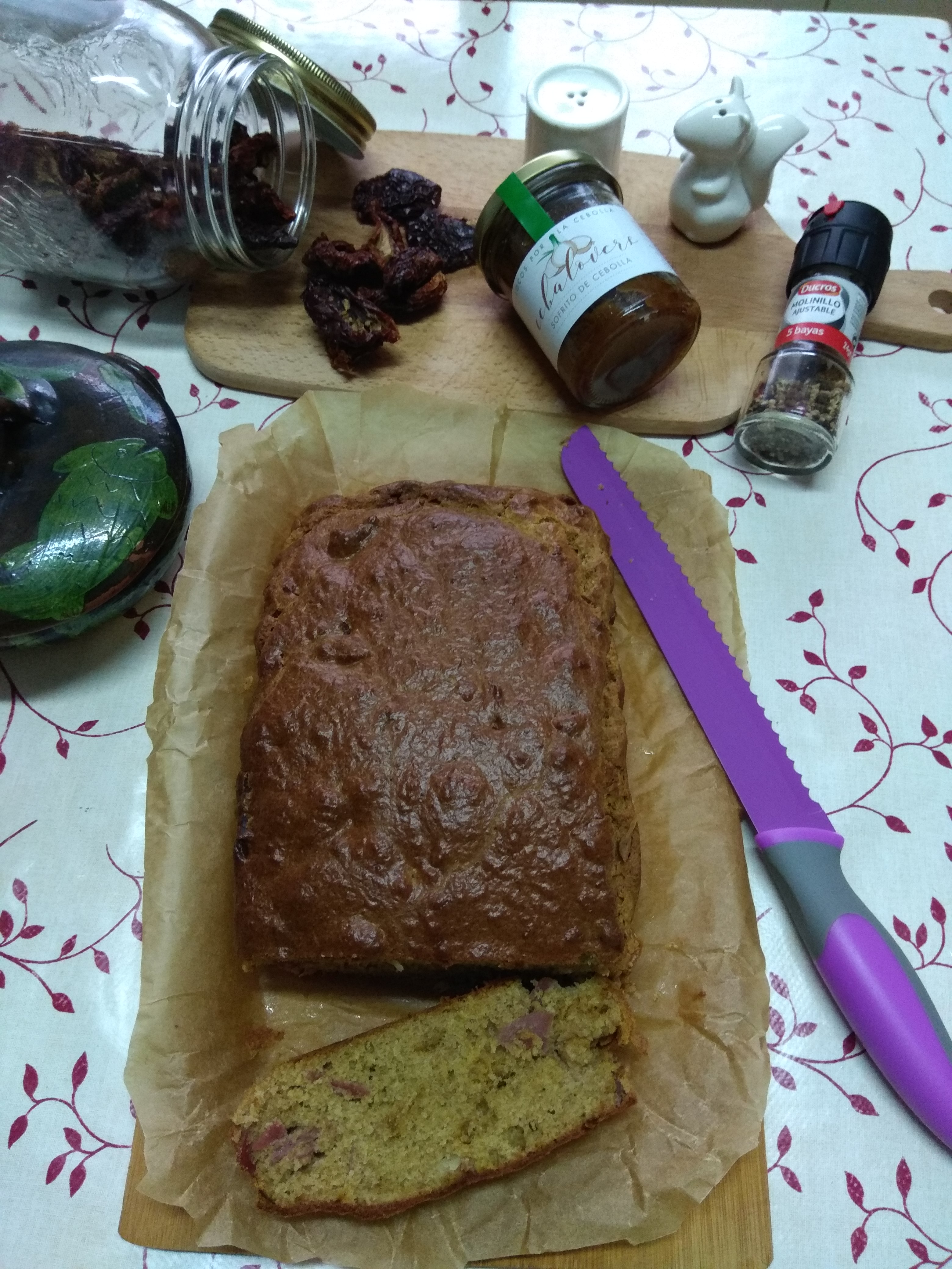 Os traigo un bizcocho salado tan versátil como imaginación tengas. Hoy lo hice de jamón serrano, tomate seco y cebolla frita con curry pero le podéis añadir o quitar ingredientes, por ejemplo unas aceitunas negras sin hueso le van de maravilla. También pasa lo mismo con las especias, puedes ponerle la mezcla de especias mediterránea que le va perfecto.