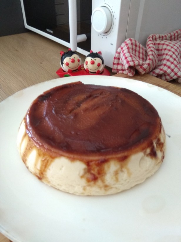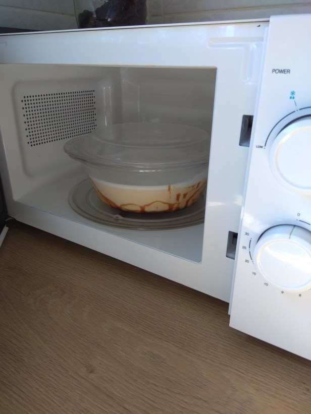 Batir y verter en un molde caramelizado apto para microondas y tapar.