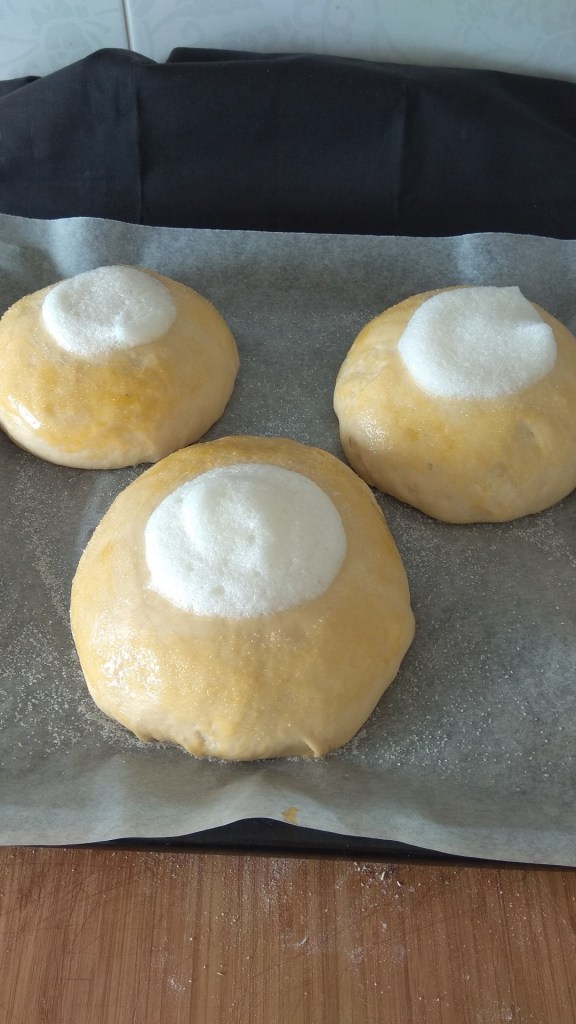 - Pasado ese tiempo poner el horno a precalentar a 200°. Batir una clara a punto de nieve, con la yema restante pinta las bolas con cuidado, pon un montoncito de clara encima y espolvorea con azúcar. Bajar el horno a 160° meter los bollos durante 30 minutos aproximadamente.