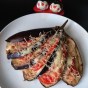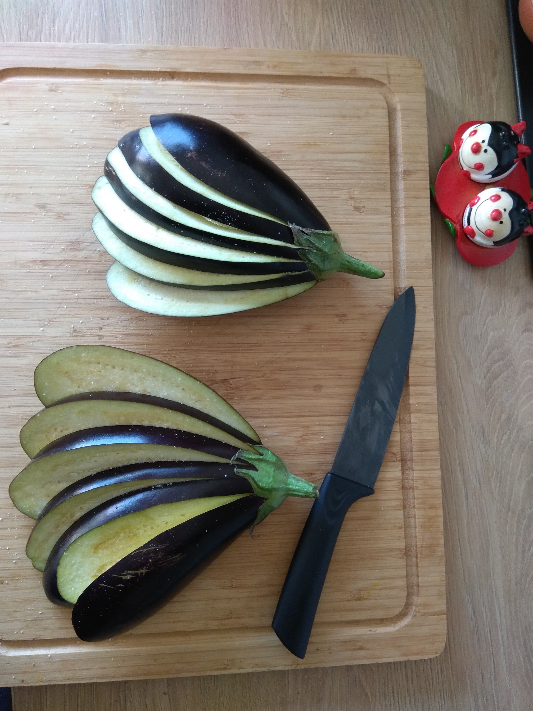 Lavamos y cortamos las berenjenas en abanico y salamos.