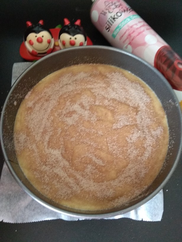 Engrasamos el molde, yo lo hago con spray desmoldante que hay en cualquier supermercado, y vertemos la mezcla. Podemos poner una mezcla de azúcar con canela por encima si queremos que nos salga la costra como la de las fotos.