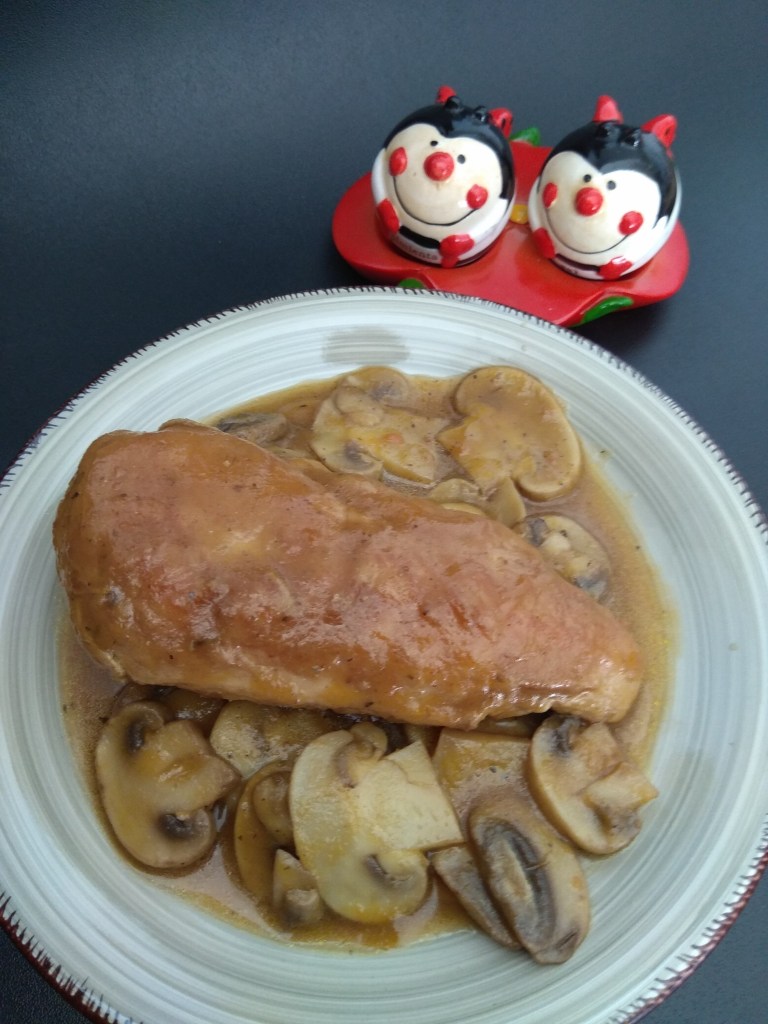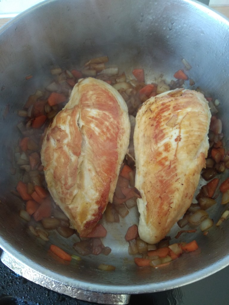 - Ponemos en una olla un buen chorro de AOVE y metemos el ajo y las pechugas. Los freímos muy bien por fuera, hasta que estén bien doraditas, no hace falta que estén hechas por dentro porque luego hay que guisarlas. Una vez doradas las apartamos a un plato y ponemos en ese mismo aceite la cebolla y la zanahoria, sofreímos bien y añadimos un vasito de chupito de coñac, agregamos el pollo y cubrimos de agua.
