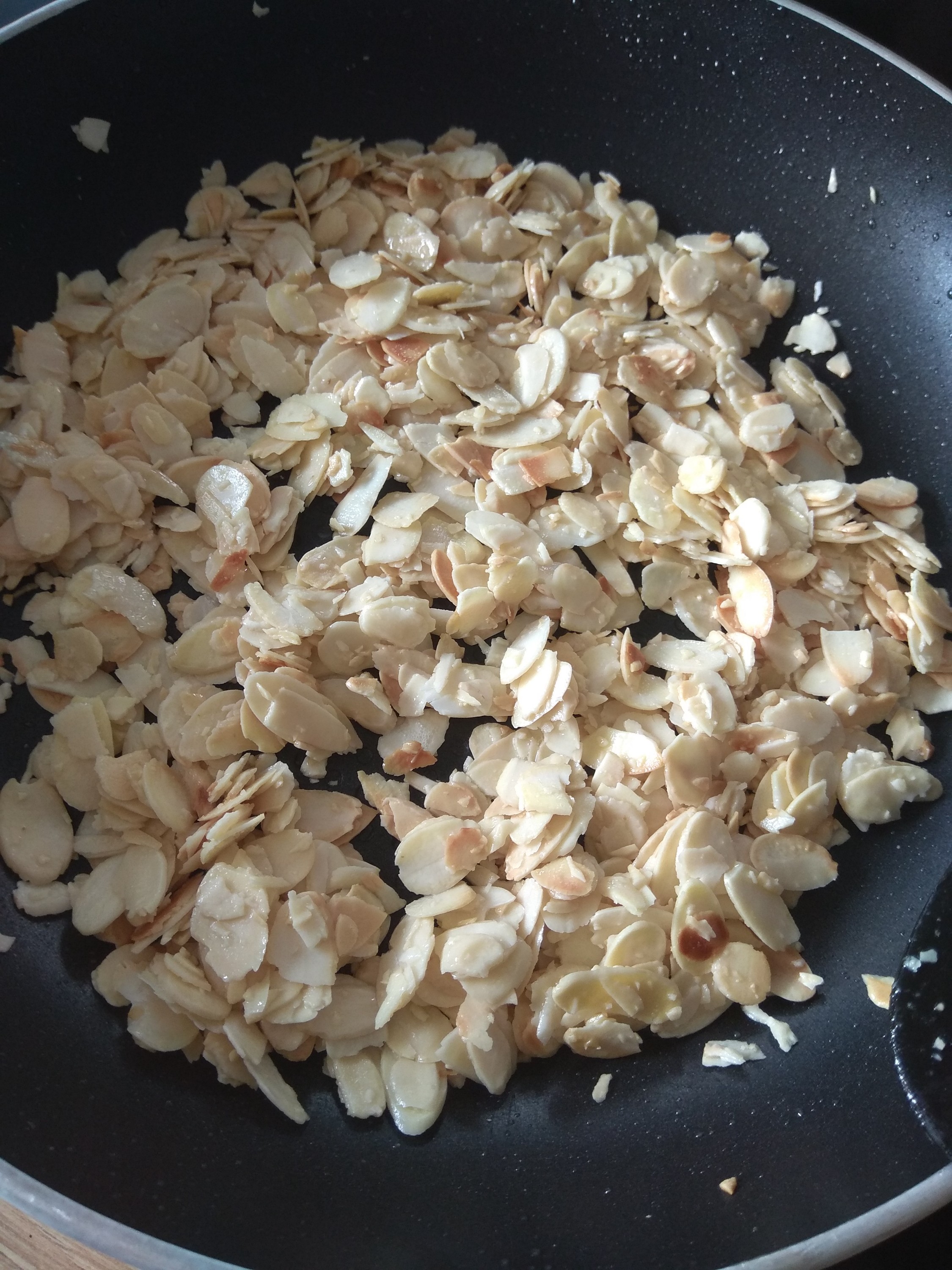 Ahora vamos a freír unas almendras, yo solo tenía laminadas, hay que tener cuidado que no se quemen y las reservamos.