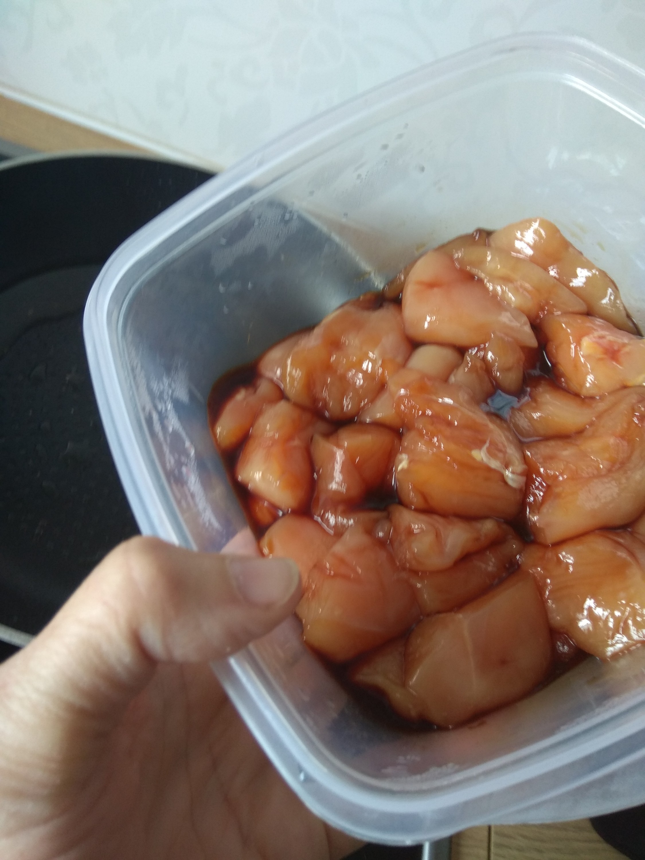 Por otro lado, ponemos a macerar media hora unos taquitos de pollo, yo en éste caso dos pechugas a trocitos.