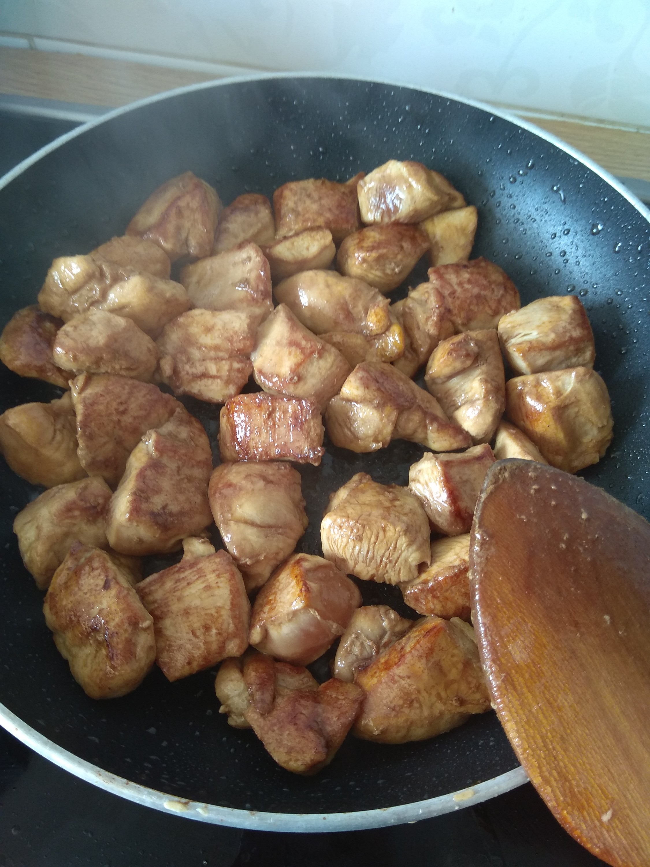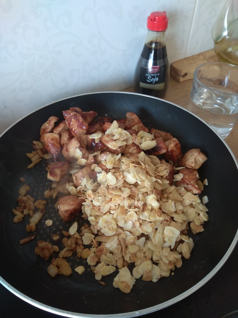Seguimos ahora con media cebolla troceada y cuando la tengamos buen pochadita le agregamos una cucharadita de harina, le damos unas vueltas, añadimos el pollo y las almendras, un chorrito de salsa de soja, un vaso de agua y dejamos que reduzca un poco.