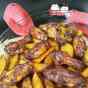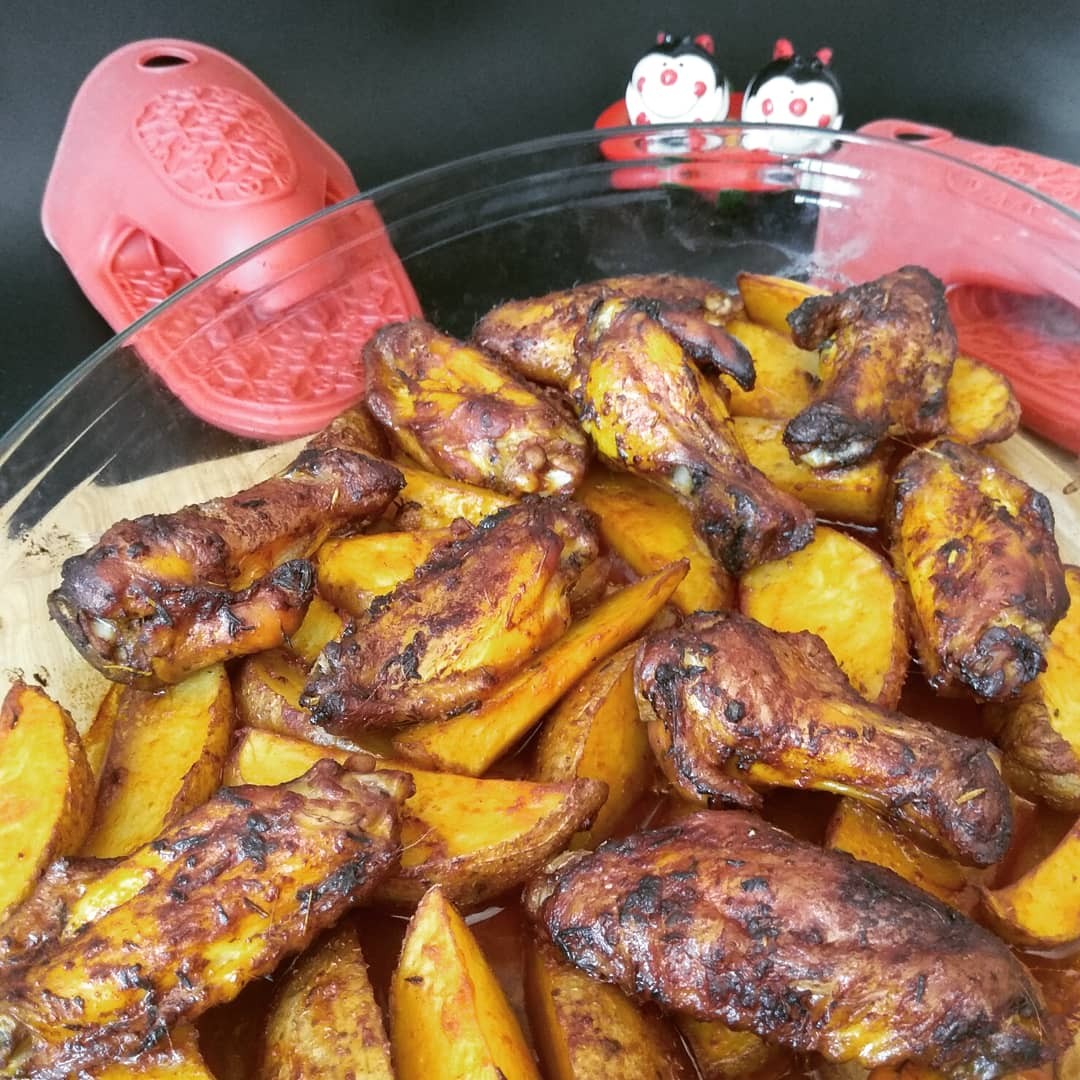 Una vez maceradas ponemos el horno que vaya calentando a 210° y mientras sacamos las alitas y las ponemos un una bandeja. En ese mismo bol corta unas patatas estilo gajo bien lavadas ya que llevan la piel y ponles un poco de aceite, sal y pimentón dulce. Mezcla bien para que se impregne del adobo.