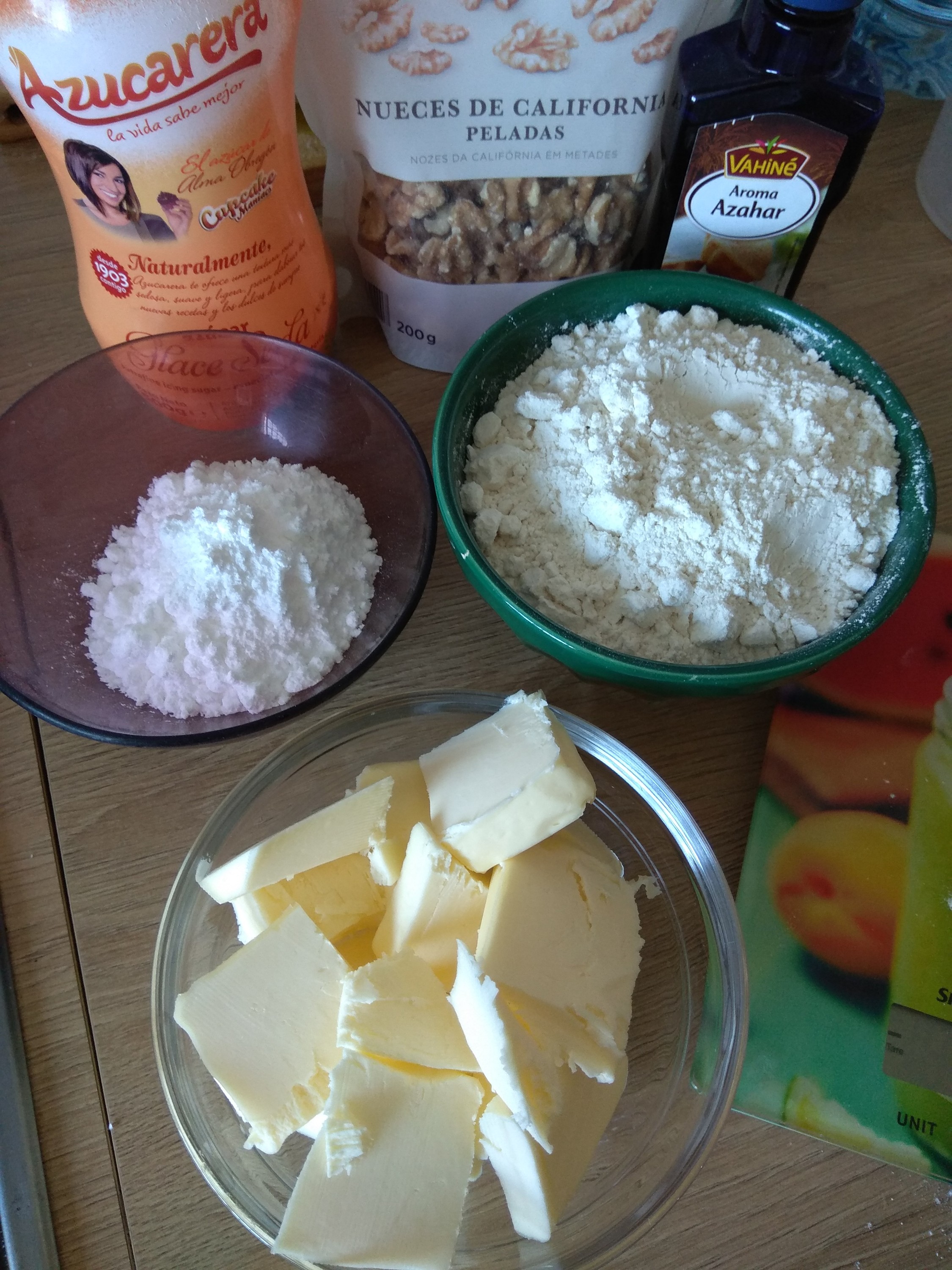 Mezclamos 200 gr de mantequilla a temperatura ambiente con 70 gr de azúcar glas durante unos 3/4 minutos hasta que veas que la masa blanquea, entonces añadimos 180 gr de harina poco a poco a cucharadas para que se integre y al final una cucharadita de agua de azahar. La masa es muy blandita pero manejable.