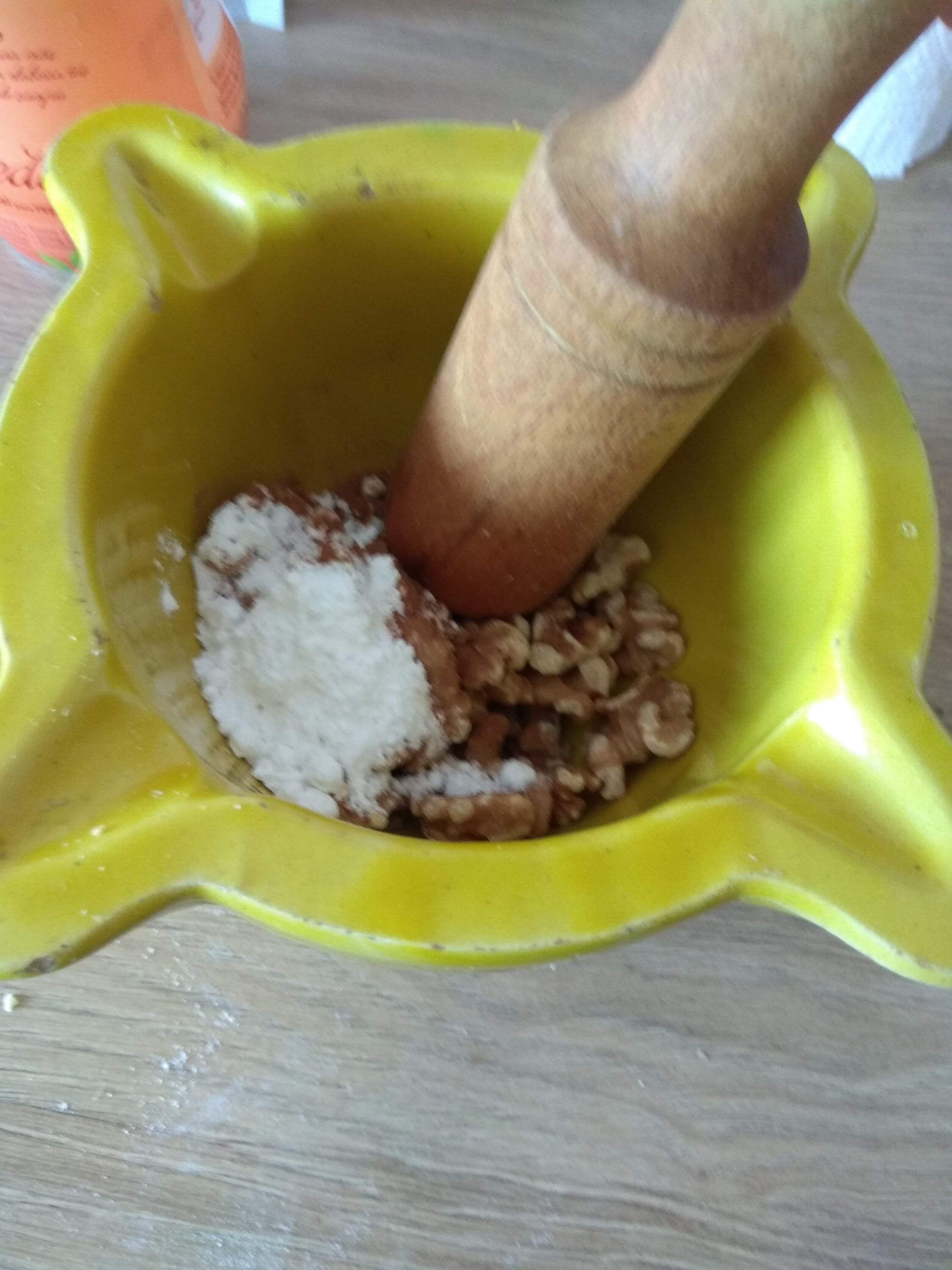 Ponemos en un mortero unas nueces con una cucharada de azúcar glas y un poquito de canela y machacamos un poco.