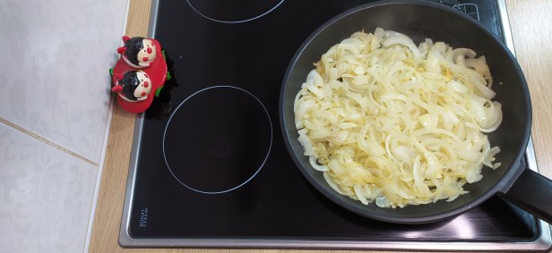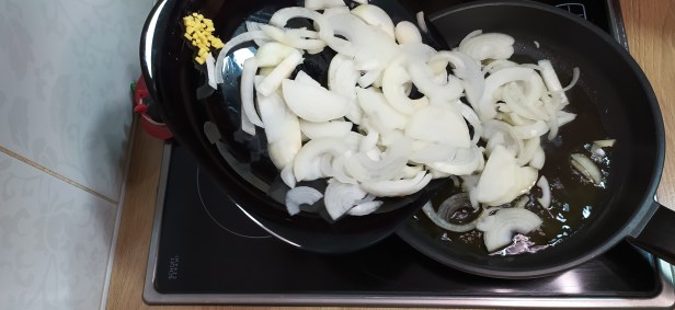 - Empezamos poniendo una sartén al fuego y agregando un poco de aceite, incorporamos la cebolla y el jengibre picado y un poco de sal, dejamos a fuego suave 20 minutos removiendo de vez en cuando para que no se pegue y conseguir una cebolla muy blandita.