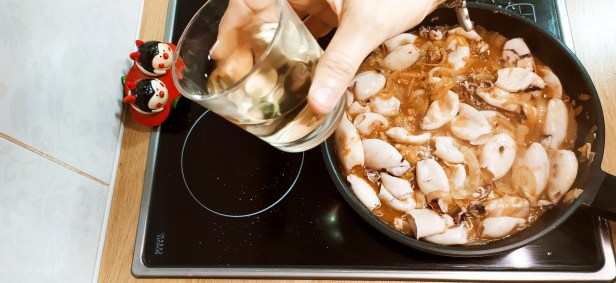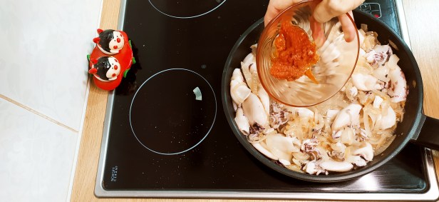 - Subimos un poco el fuego y hacemos un hueco en el centro de la sartén para incorporar los calamares, los mezclamos con la cebolla y dejamos cocinar 5 minutos.