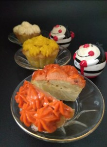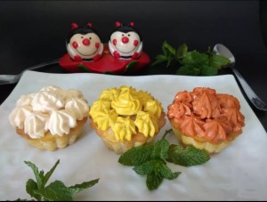 - Montar los muffins. Una vez sacados los muffins del horno dejarlos enfriar. Ponemos las mayonesas en mangas desechables y los adornamos a nuestro gusto.