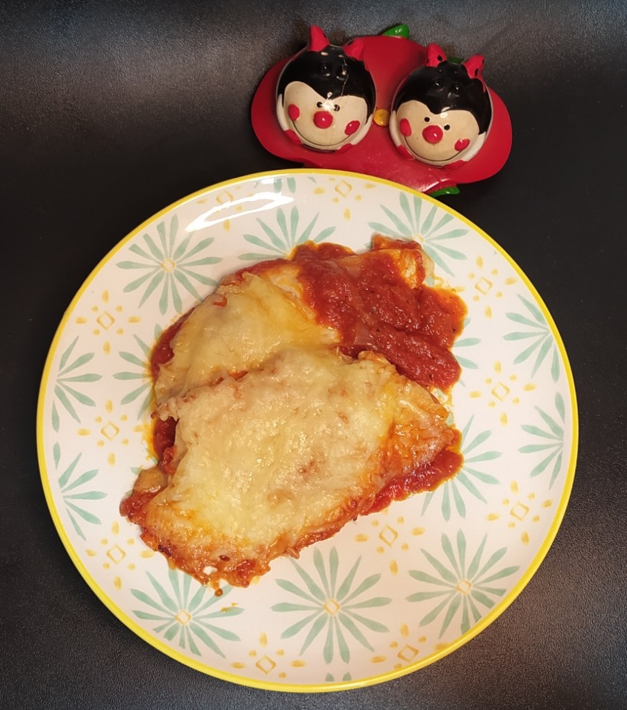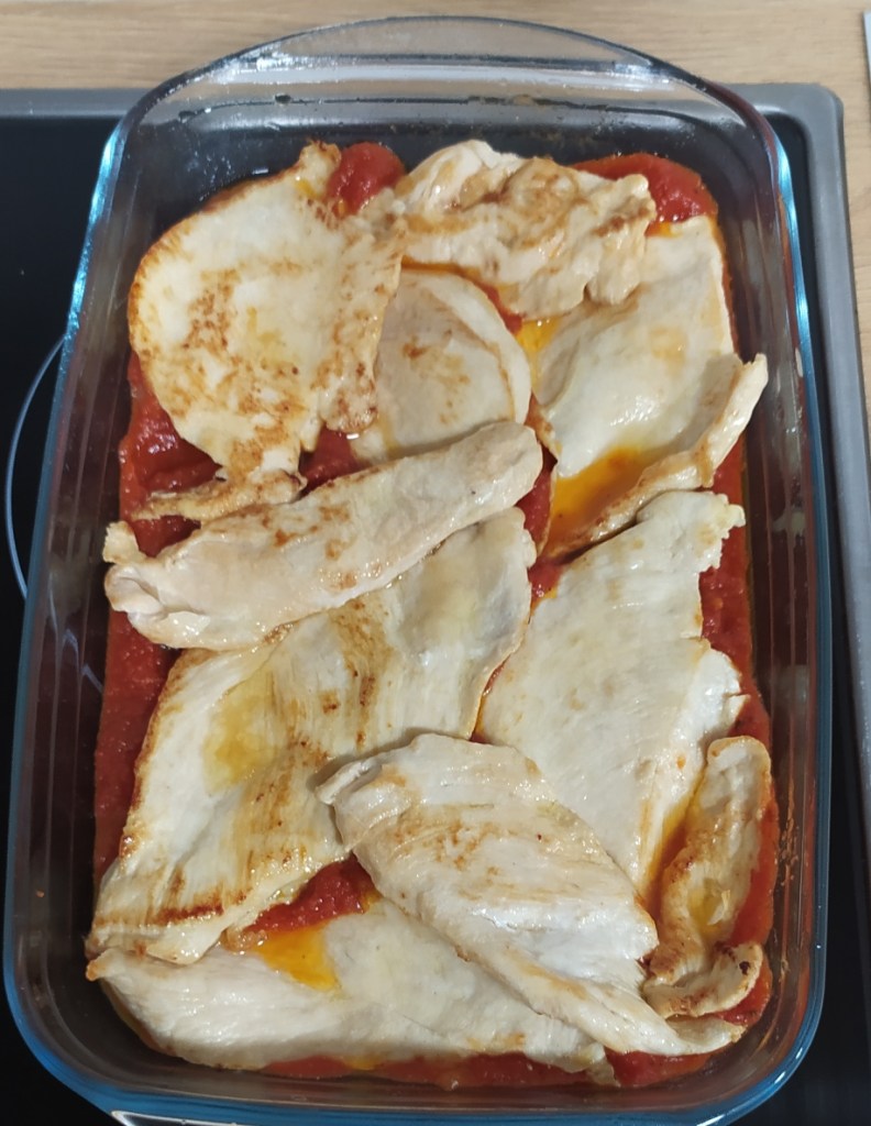 - Vamos poniendo los piletas de pollo encima haciendo una ligera presión para que se integren un poco con la salsa.