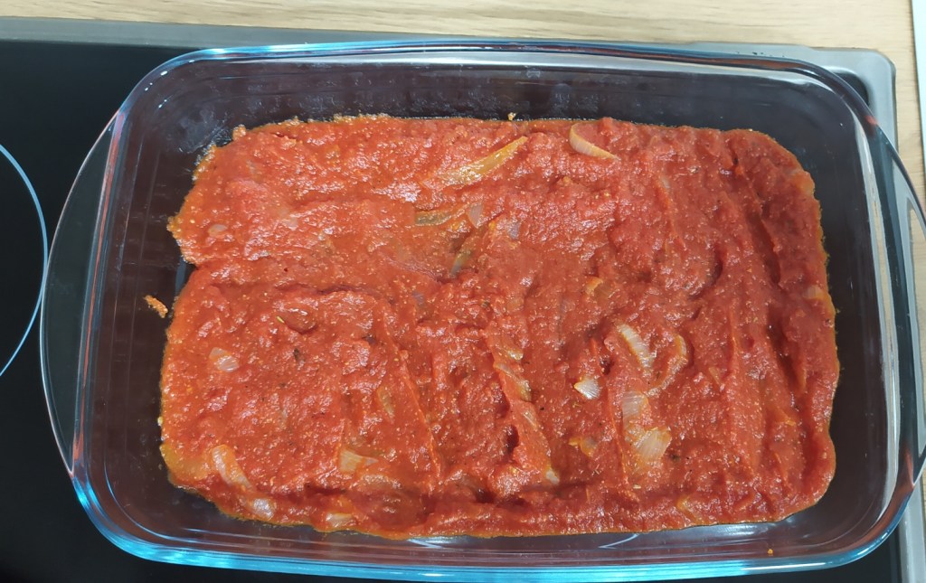 - En un recipiente apto para el horno ponemos una buena capa de salsa de tomate.