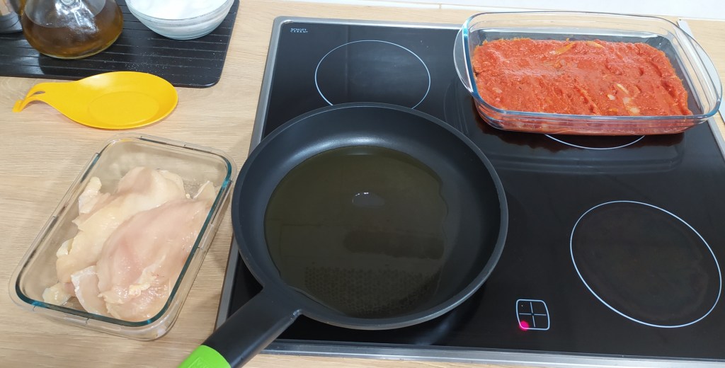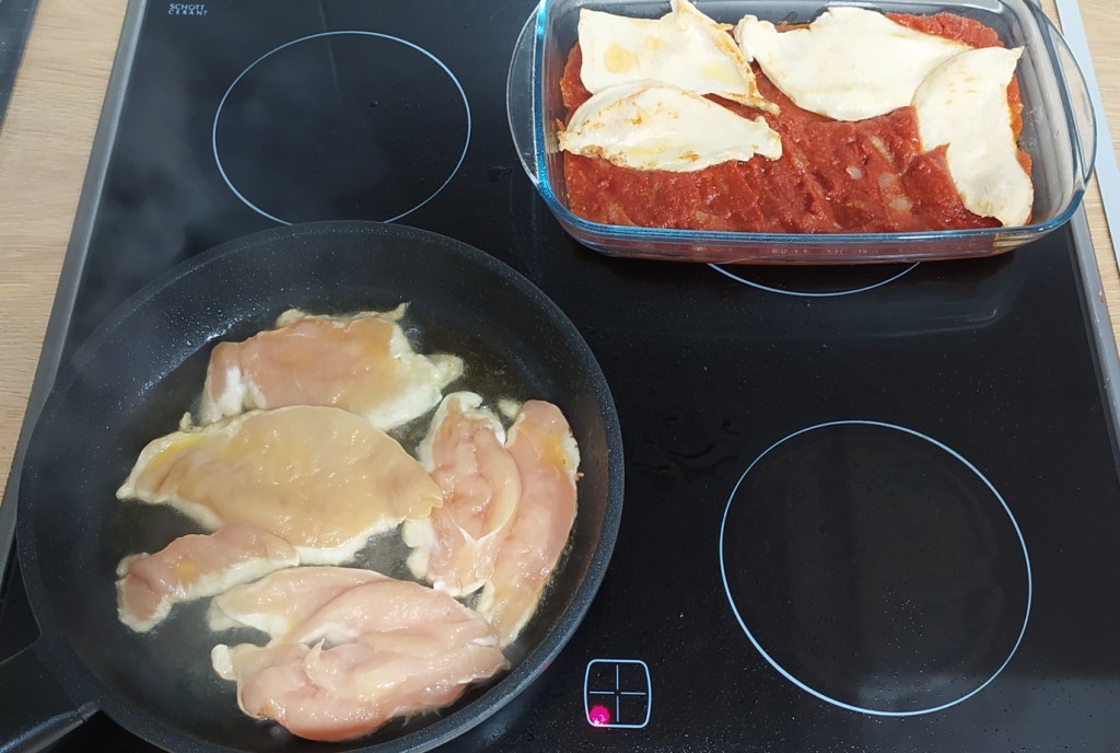- Salamos el pollo y lo vamos friendo en una sartén y reservando. No hay que hacerlo mucho porque luego irá al horno.
