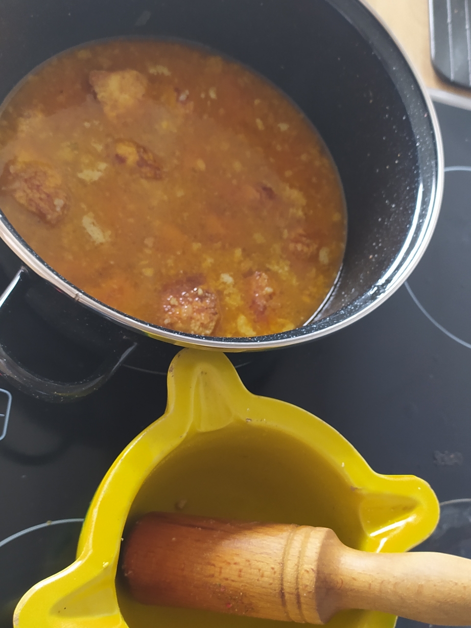 - Cuando tengamos el pollo y la cebolla listos le ponemos el brandy dejando unos minutos para que se evapore el alcohol y añadimos la mezcla del mortero, ponemos el resto de agua que nos queda, añadimos sal y pimienta y dejamos que reduzca durante 10 minutos removiendo de vez en cuando.