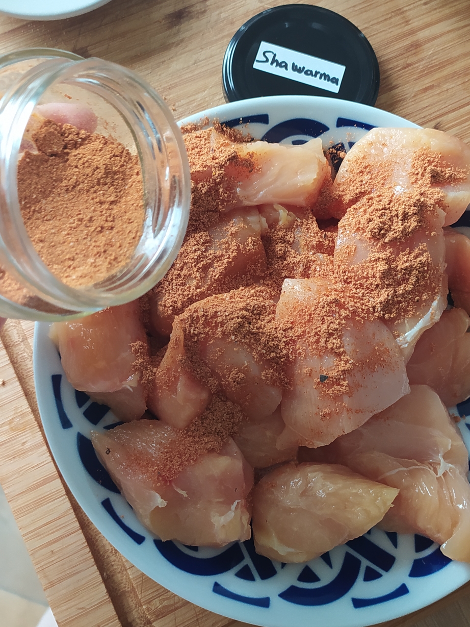 - Cortamos el pollo a trozos, cubrimos con la mezcla de especias Shawarna y dejamos macerar durante media hora.