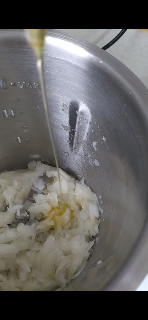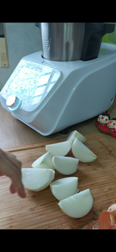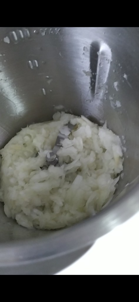 - Pelar y cortar las cebollas a cuartos. Meter en el vaso, tapar y programar 30 seg. Vel. 6 (si te gusta mas triturado puedes darle varios golpes de turbo)