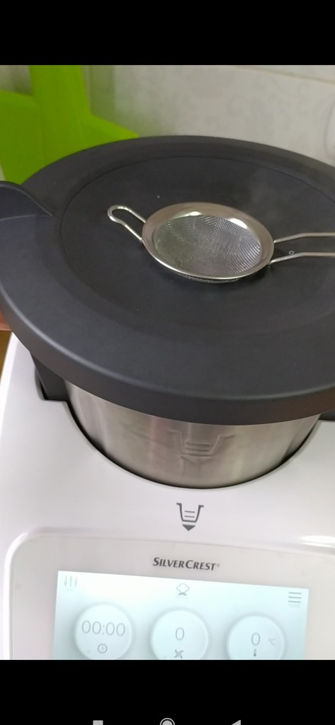 - Abrir, bajar con una espátula de silicona lo que pueda quedar por las paredes del vaso y poner el aceite, tapar y programar 15 min. Vel. 1 marcha atras, 110°. Quitar el tapón y poner una rejilla o un colador para que salga el vapor.