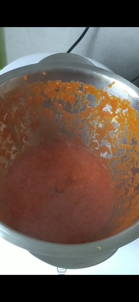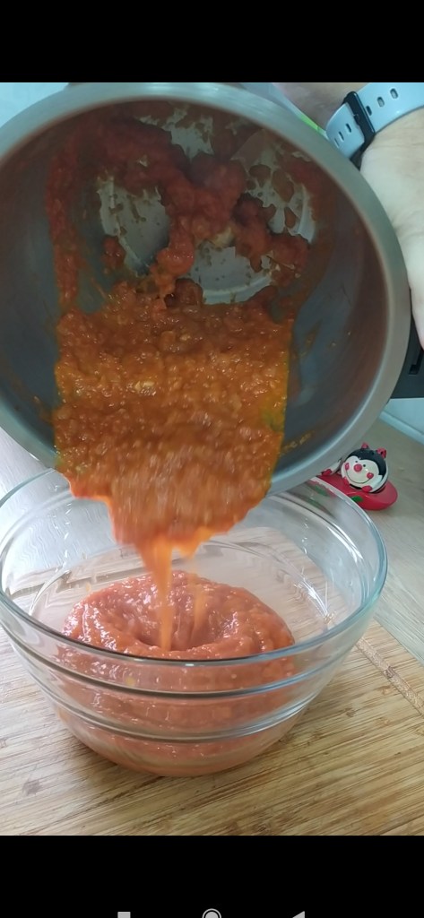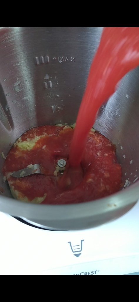 - Abrir con cuidado y echar el tomate y la sal. Tapar y programar 30 min. Vel. 1 110°. Dejar el colador para que salga el vapor.