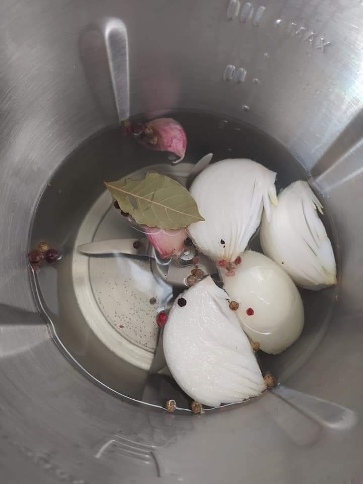 Ponemos el agua en el vaso de la máquina y le añadimos la cebolla pelada y cortada en 4 trozos, los ajos, el laurel y la pimienta.
