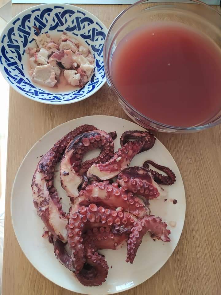 Sacalo del cestillo y cuela el caldo( no lo tires que es un caldo maravilloso para un arroz o cualquier preparación que necesites caldo de pescado, incluso lo puedes congelar), trocea el pulpo y ya lo tienes listo para comer.