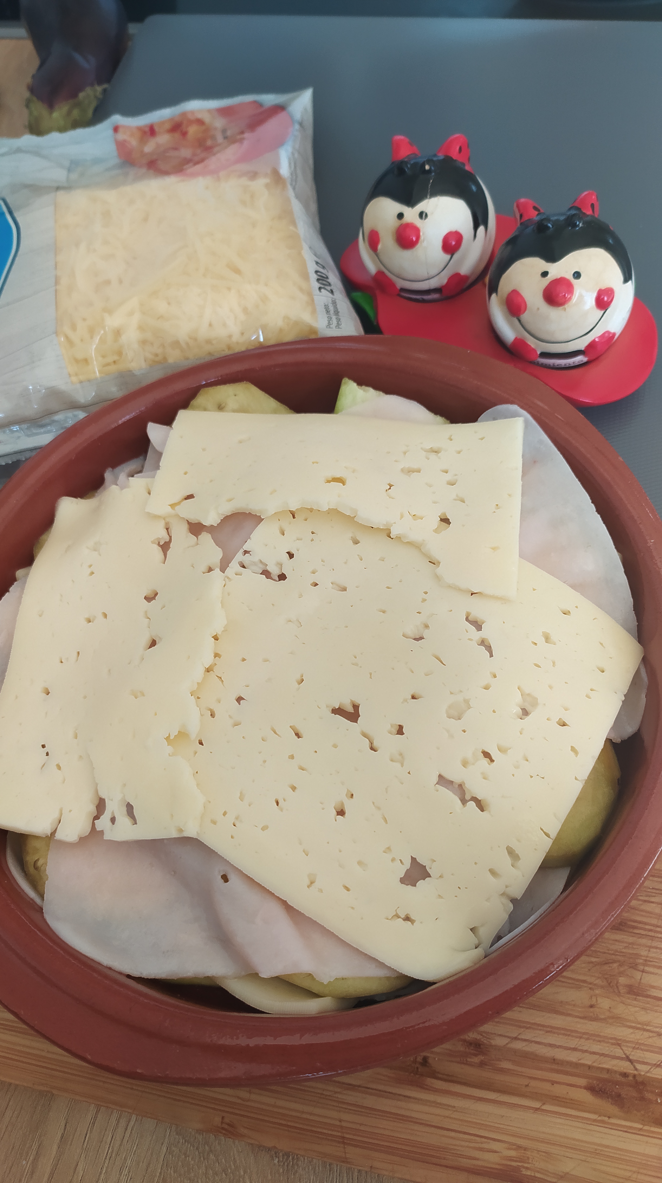 - Encima una capa de jamón cocido y otra de queso en lonchas.
