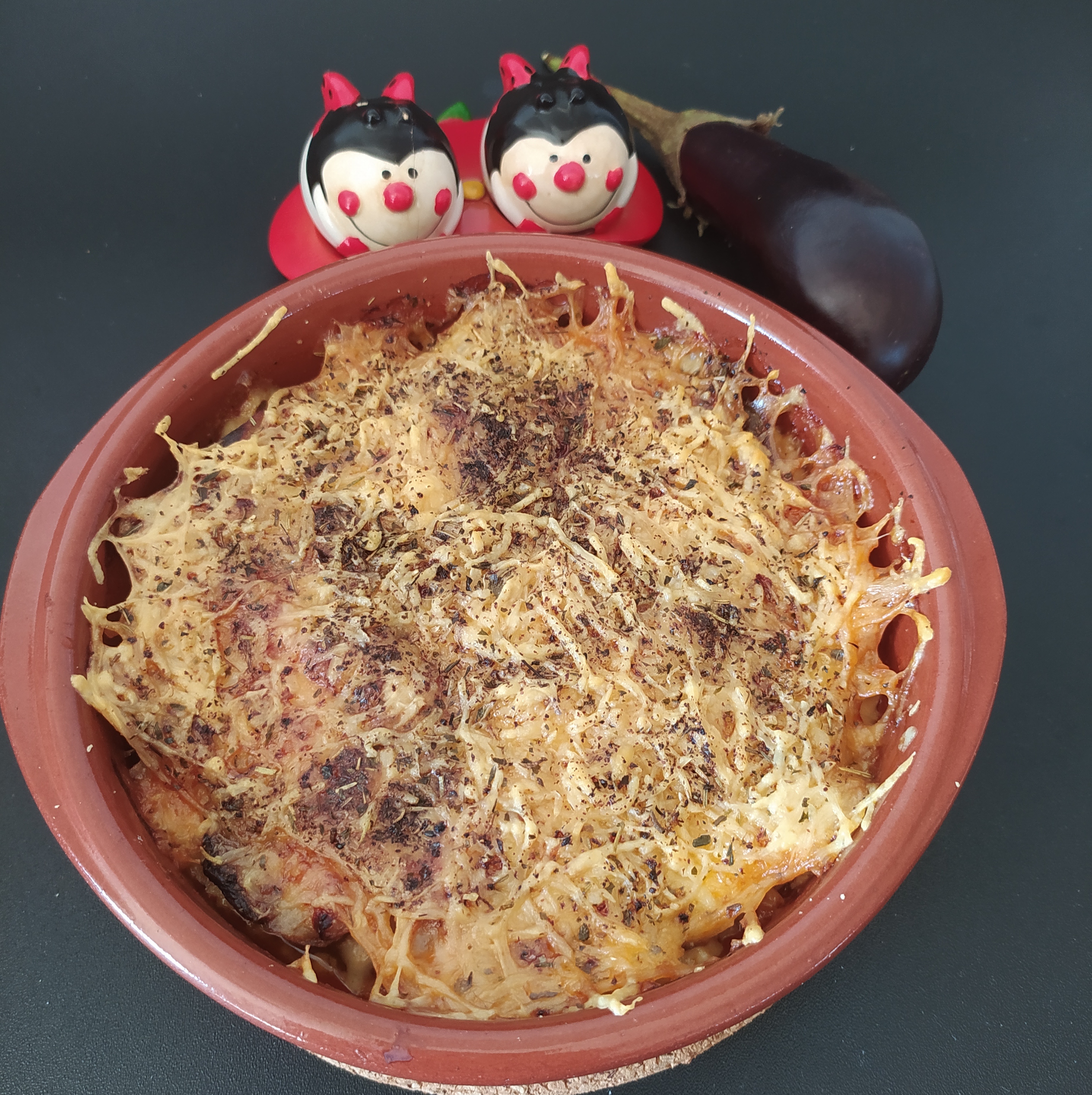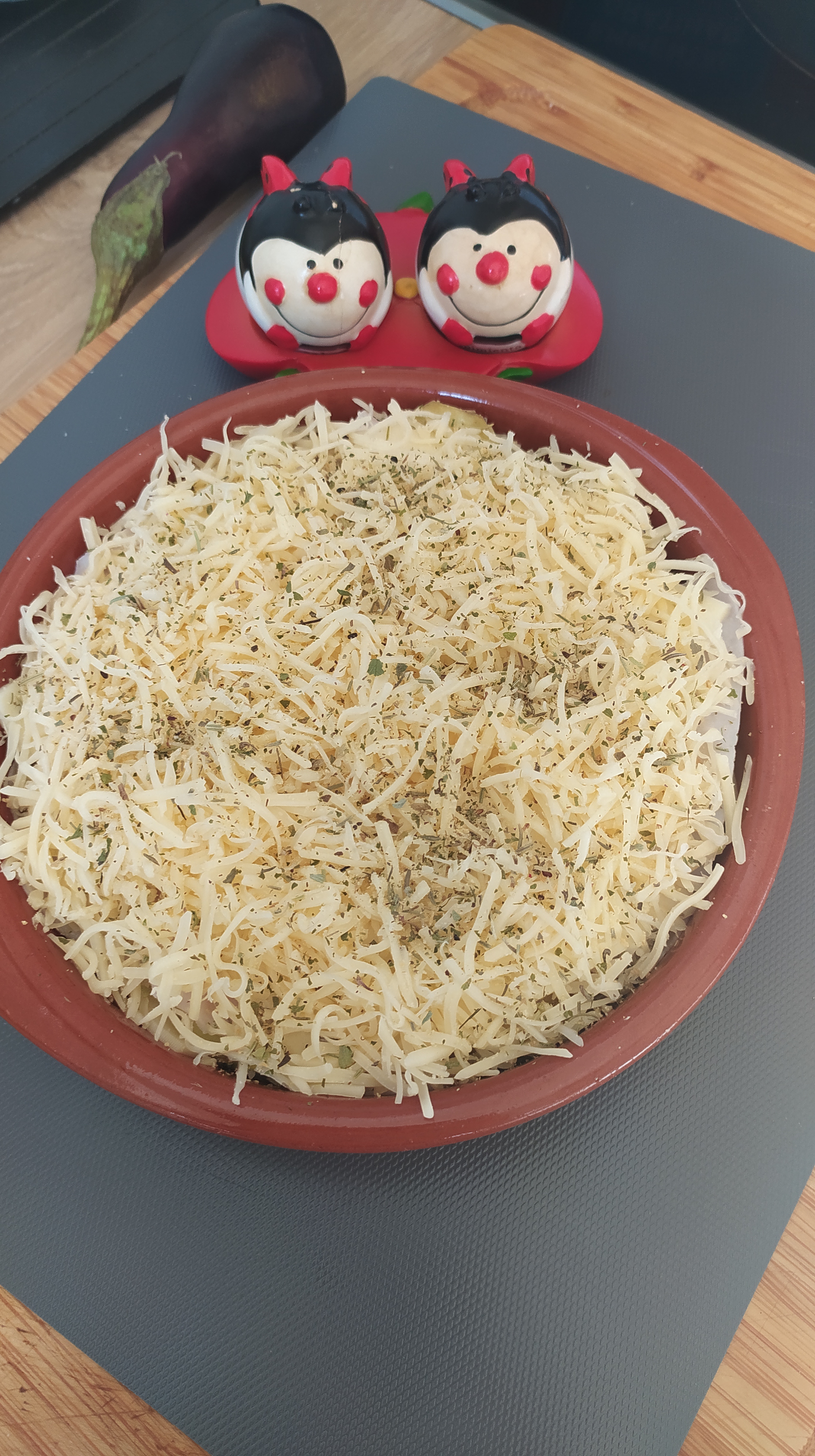 - Por último otra capa de berenjena, cubrimos con queso rallado y le ponemos las especias.