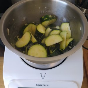 - Bajamos de las paredes la cebolla e introducimos los calabacines a trozos, lavados y sin pelar, solo le quitamos las puntas.