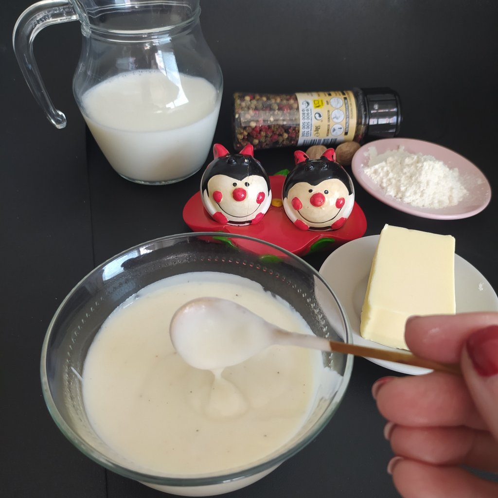 Ponemos un cazo al fuego y metemos la mantequilla, cuando esté casi derretida metemos la harina y removemos bien durante 3/4 minutos para que se cocine la harina, entonces añadimos toda la leche, un pellizco de sal, la pimienta y la nuez moscada y con unas varillas empezamos a remover a fuego medio. Poco a poco irá espesando y la puedes dejar a la consistencia que mas te guste, si se queda muy espesa y la quieres mas ligera puedes añadirle leche y seguir removiendo.