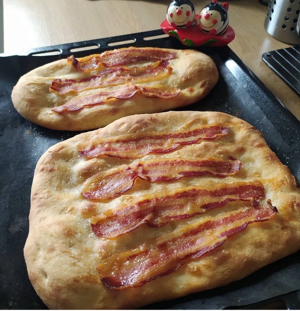 - Cogemos las bolas de masa y las chafamos despacio con los dedos dándoles la forma que queramos, ponemos la panceta, o el embutido que te guste, y un poco de sal.
