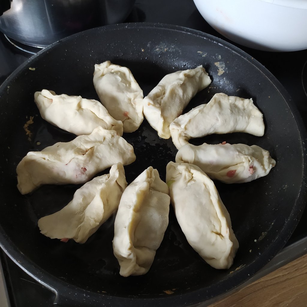 - Ponemos una sartén al fuego y le añadimos una cucharada de aceite, vamos poniendo las empanadillas en circulo y las dejamos que se doren sin mover, añadimos agua hasta cubrir por la mitad, tapar y dejar cocinar hasta que esté casi evaporado, añade unas gotas de aceite y deja unos minutos mas.