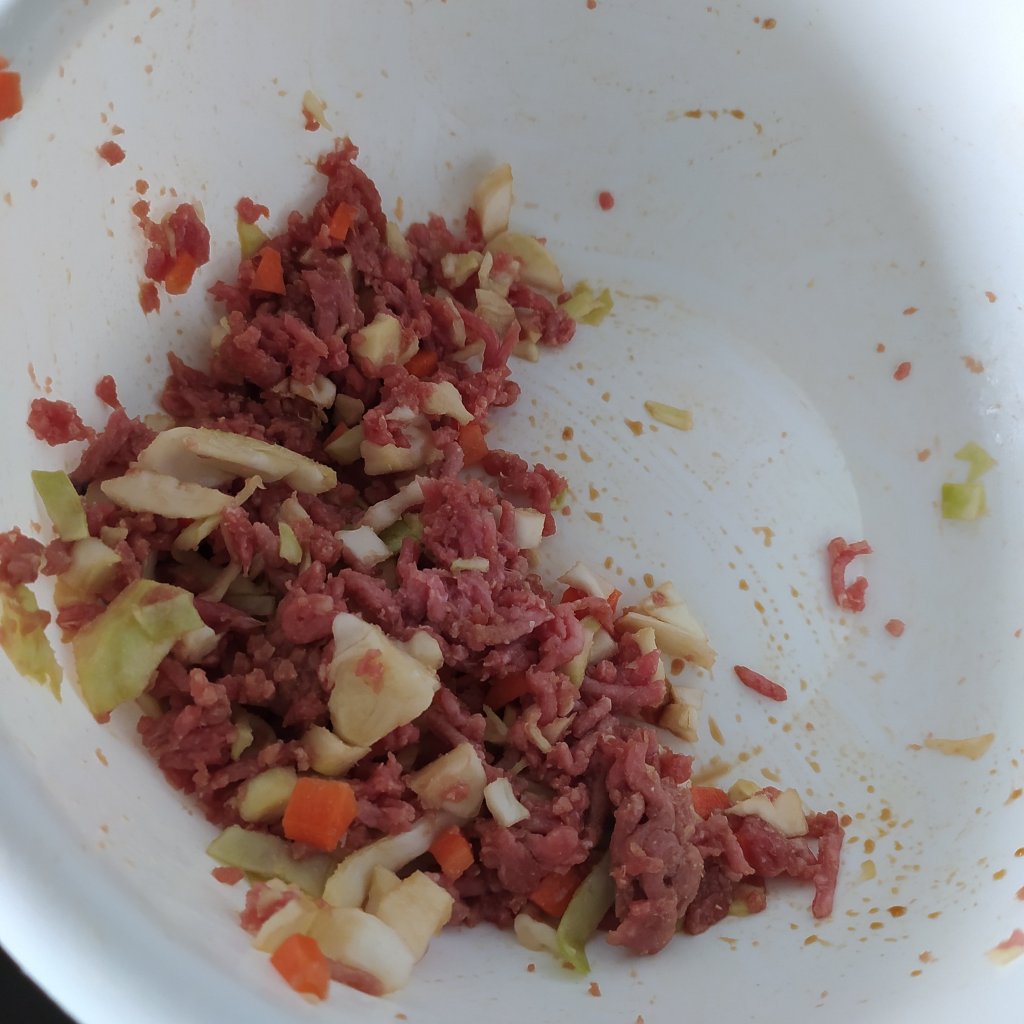 - Pelamos y cortamos la zanahoria a cuadraditos pequeños, cortamos la col a tiras finas y lo incorporamos a un bol junto a la carne picada, le ponemos 2 cucharadas de salsa de soja y lo mezclamos bien con las manos. Tapamos y reservamos.
