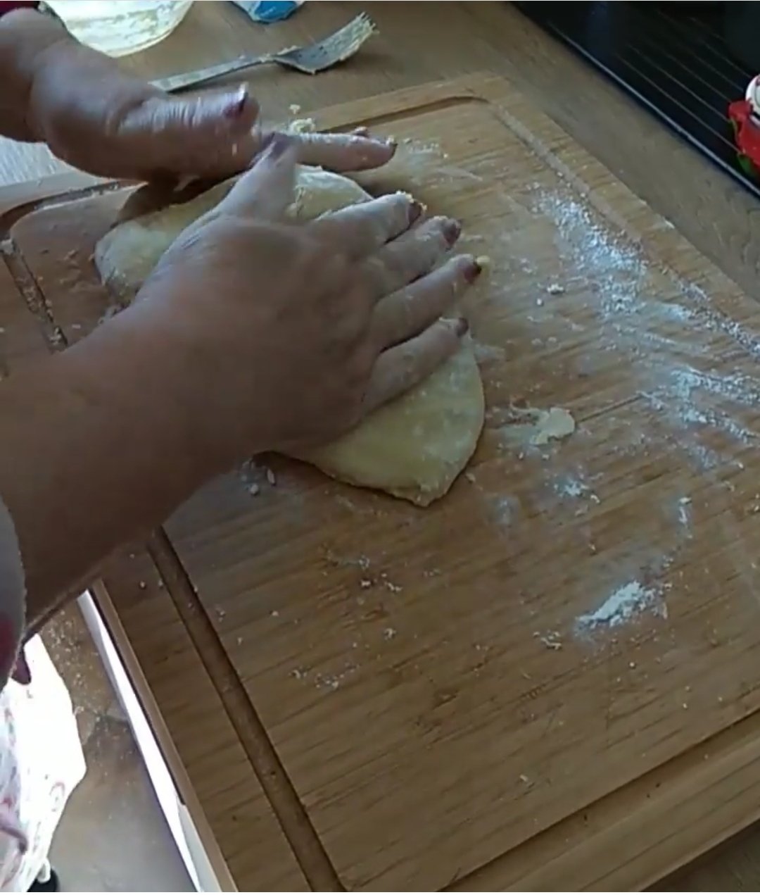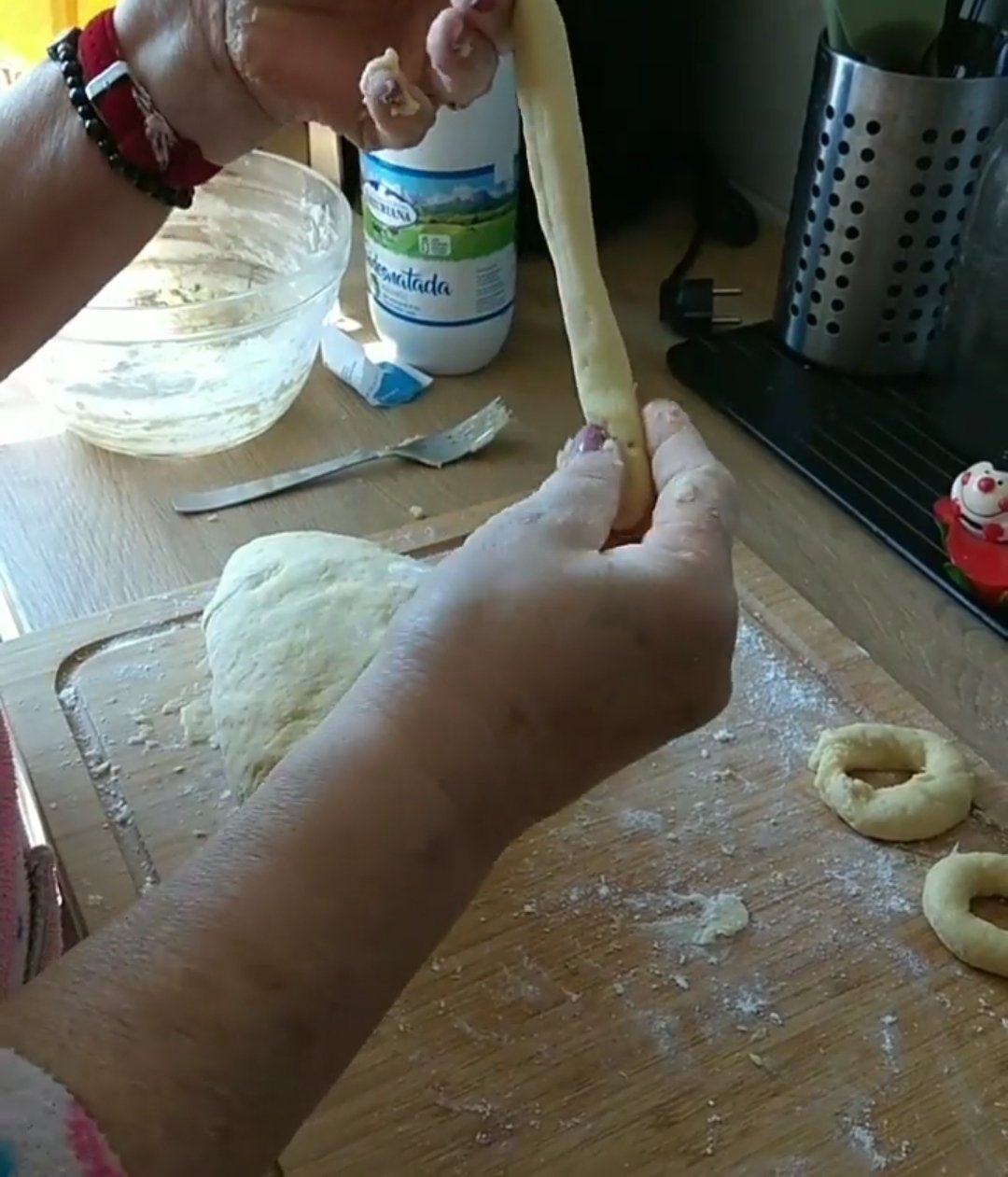 - Formamos los roscos cogiendo porciones y haciendo churros para unirlos, los vamos dejando en una bandeja y le hacemos unos pequeños cortes con el cuchillo antes de freír..