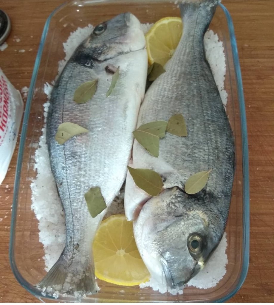- Ponemos una capa de sal gruesa en la bandeja apta para el horno, un poco de pimienta negra molida y hierbas aromáticas al gusto. Encima, las doradas ya limpias, un poco de laurel, rodajas de limón y capa de sal gruesa cubriendo bien todo.