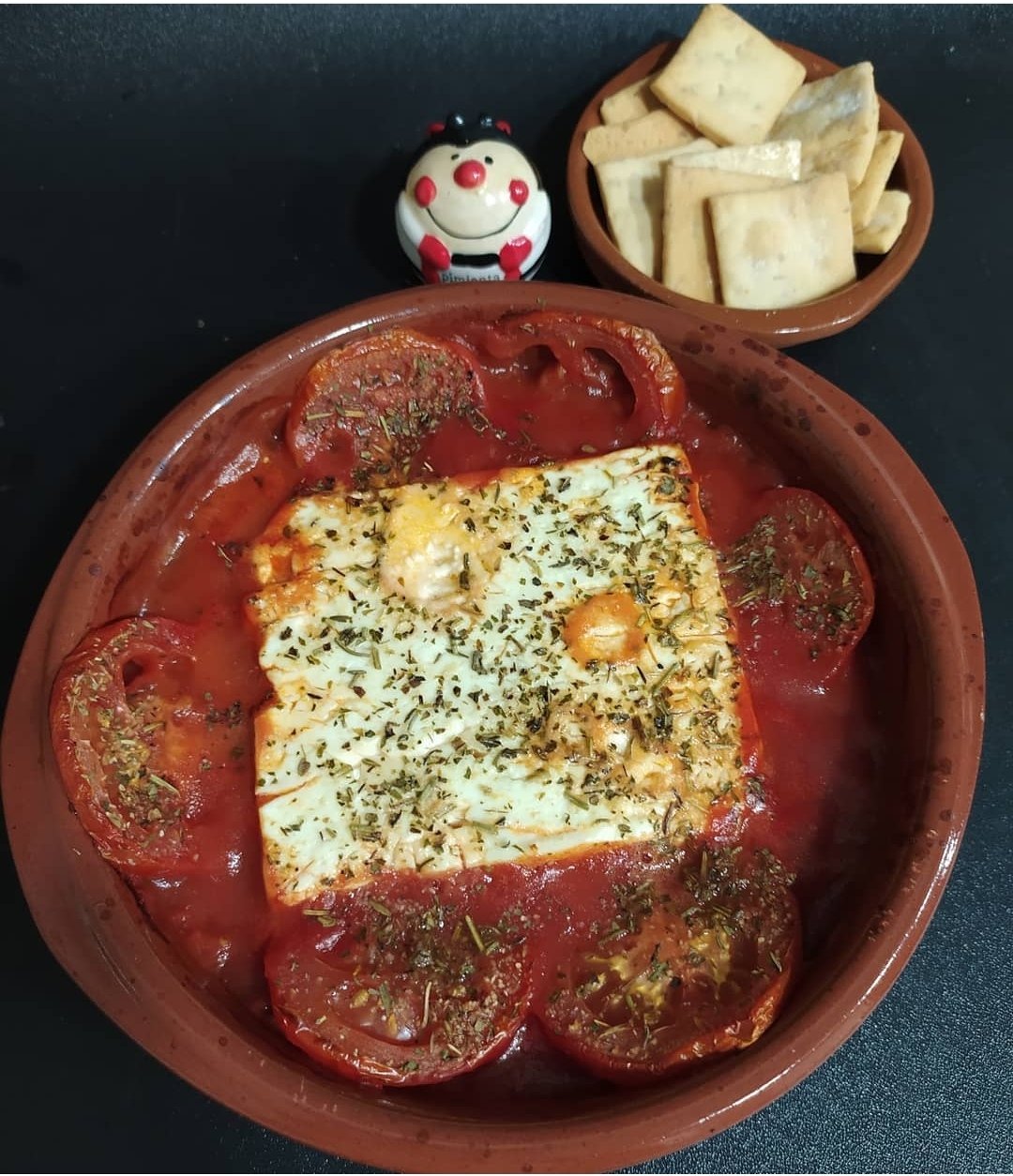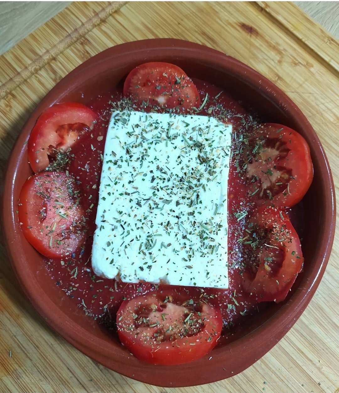 En una cazuela apta para el horno ponemos una cama de tomate triturado, el queso feta en el centro, un tomate en rodajas o tomatitos cherry y unas especias.