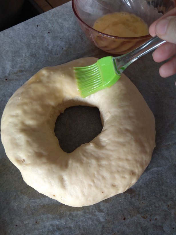 - Batimos el huevo y pincelamos la superficie del roscón suavemente con ayuda de una brocha de silicona o pincel de