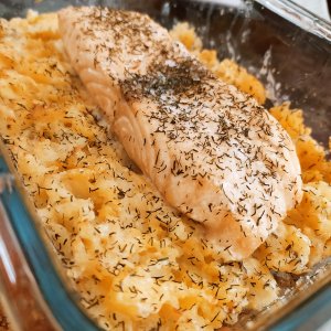 - Salmón sobre gratín de patatas al eneldo