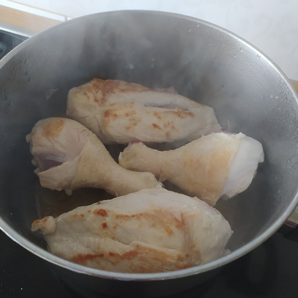 - Ponemos el aceite en una olla al fuego, añadimos el pollo que habremos salado y doramos bien por ambos lados con los ajos.