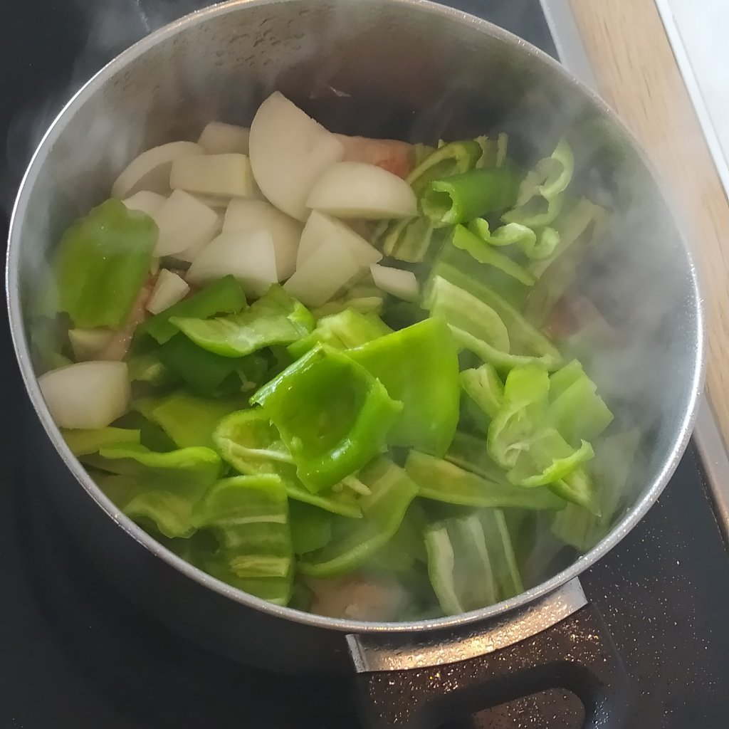 - Incorporamos el pimiento y la cebolla y rehogamos junto al pollo.