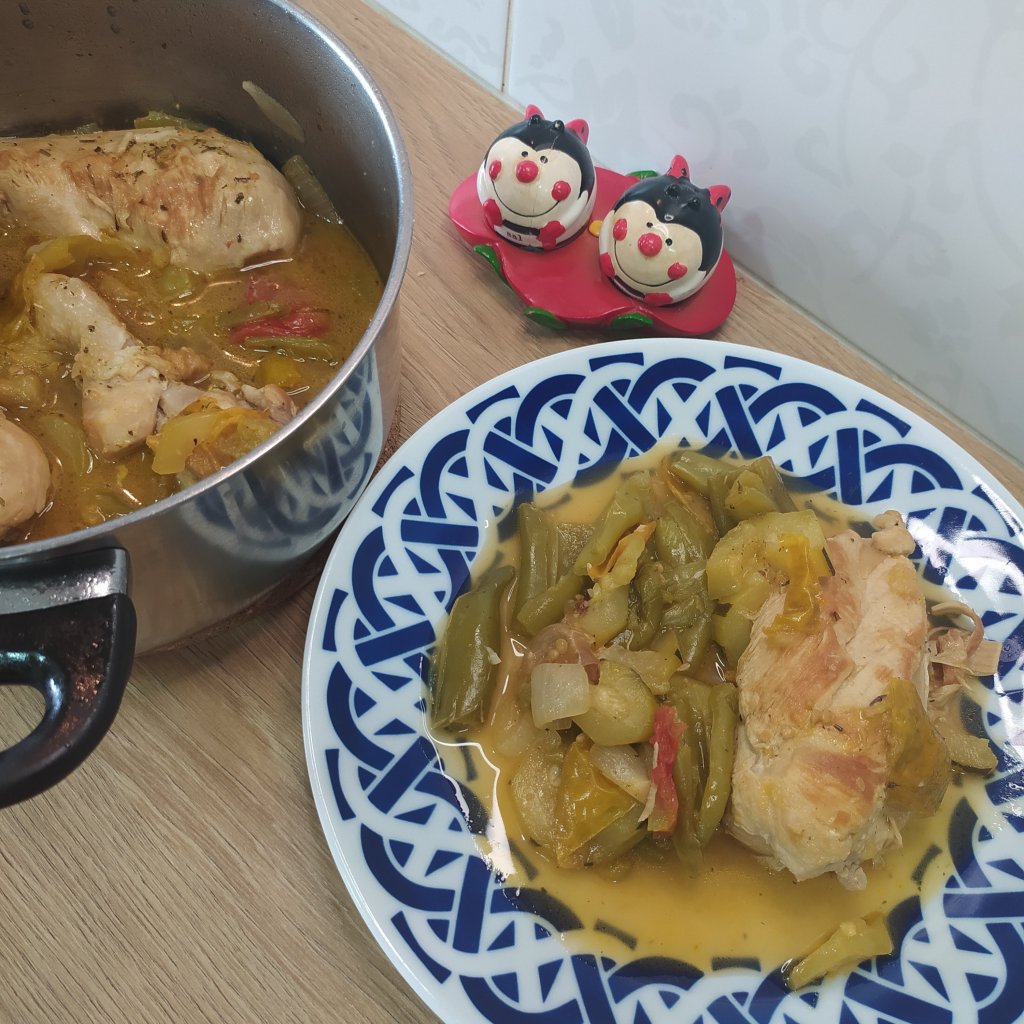 Recuerda que es una receta de aprovechamiento así que puedes utilizar las verduras que tengas en casa y también eso trozos de pollo que quedan por el frigorífico o congelador.