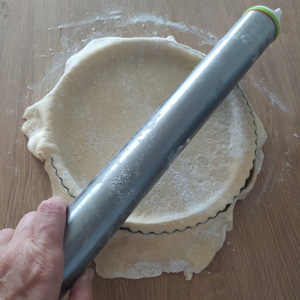 - Una vez bien repartido por el molde pasar el rodillo por encima para quitar el sobrante. Pinchar toda la base con un tenedor.