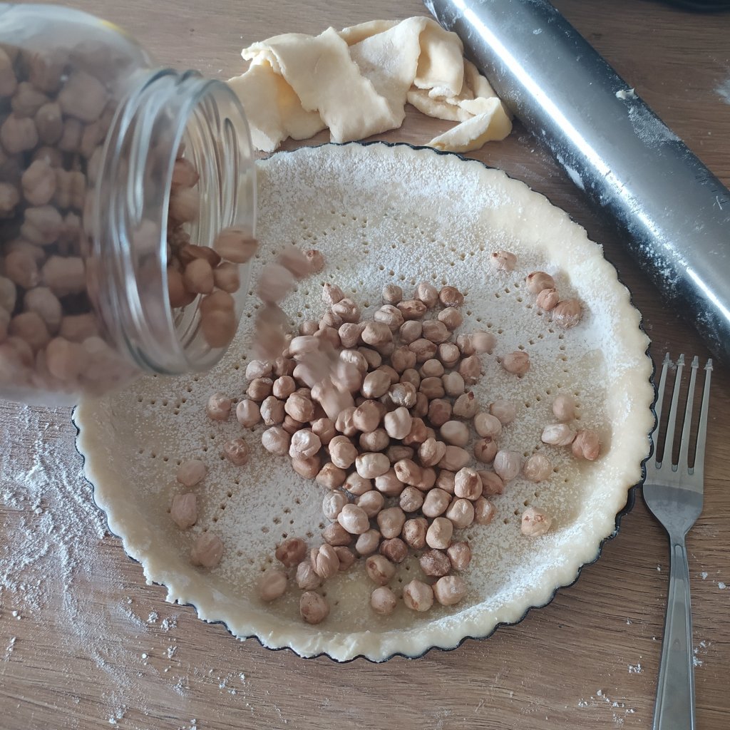 - Espolvorear un poco de harina por la base y poner garbanzos secos para que hagan peso y no suba y se rompa.