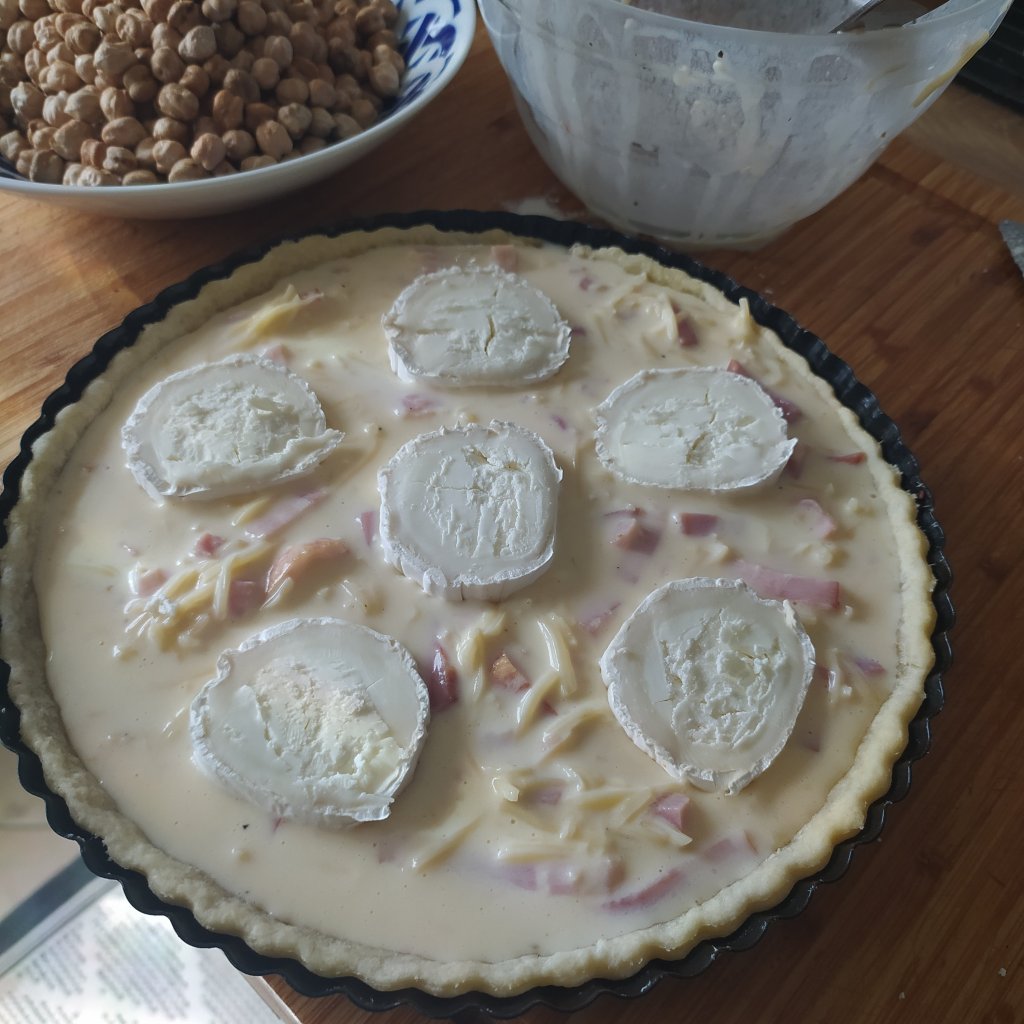 - Sacamos la masa y quitamos con cuidado el peso(garbanzos) y añadimos la mezcla del relleno que tenemos preparada. Ponemos el rulo de cabra por encima y llevamos al horno otra media hora.