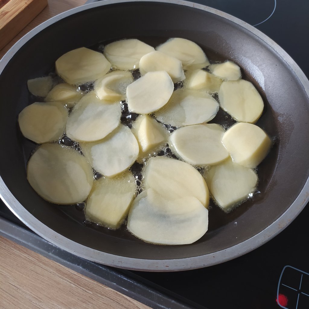 - Calentamos abundante aceite en la sarten que hemos utilizado para la cebolla y añadimos en ella las patatas que tenemos que freír, las dejamos un poco crudas porque se acabaran cociendo en el horno y las reservamos.