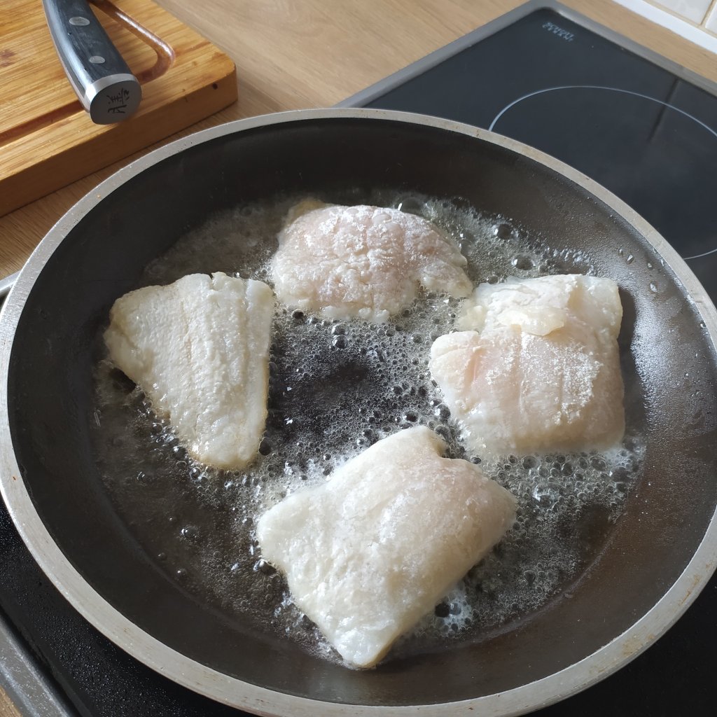 - Eliminamos el exceso de aceite y freímos los lomos de bacalao previamente enharinados. No hace falta freírlos mucho con 1 a 2 minutos es suficiente ya que van a ir al horno.