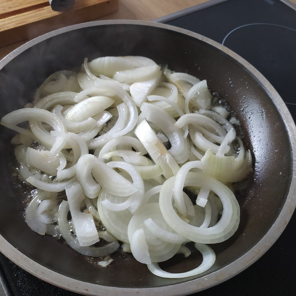 - Pelamos la cebolla y la cortamos en rodadas.