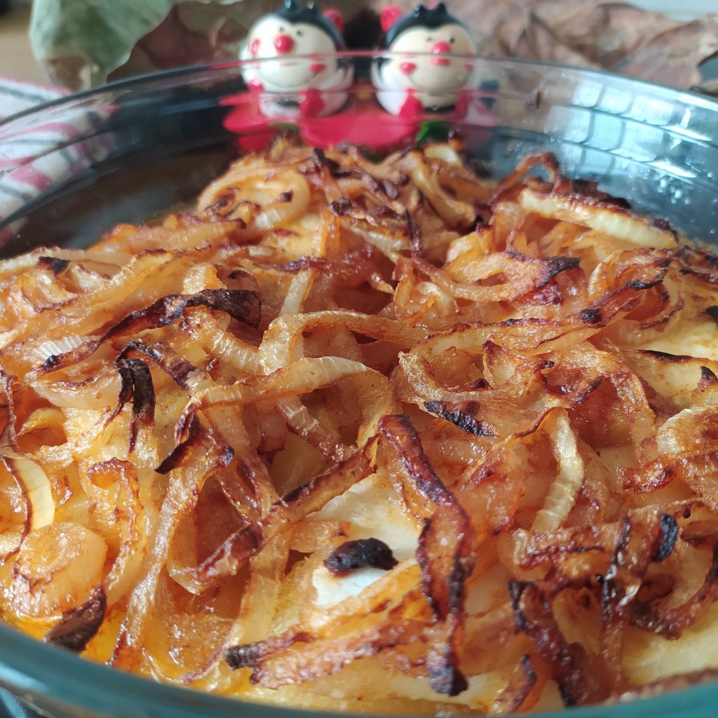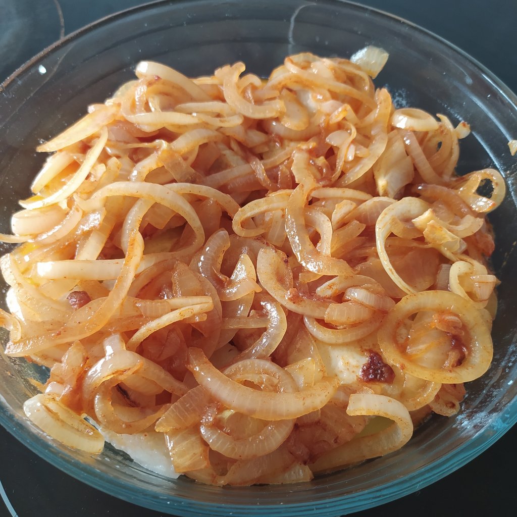 - Y por encima de todo ello y por los laterales, repartimos la cebolla y su salsa.