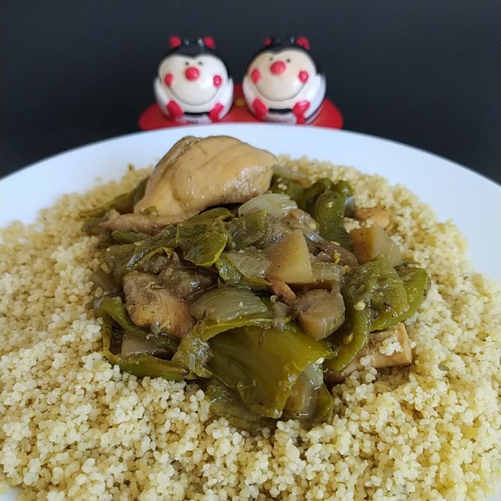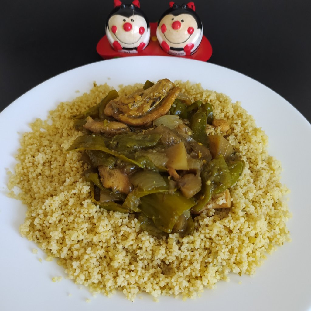 - Montamos el plato con el cous cous en forma de corona, poner en el centro el guiso de pollo y las verduras.
