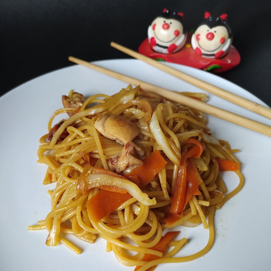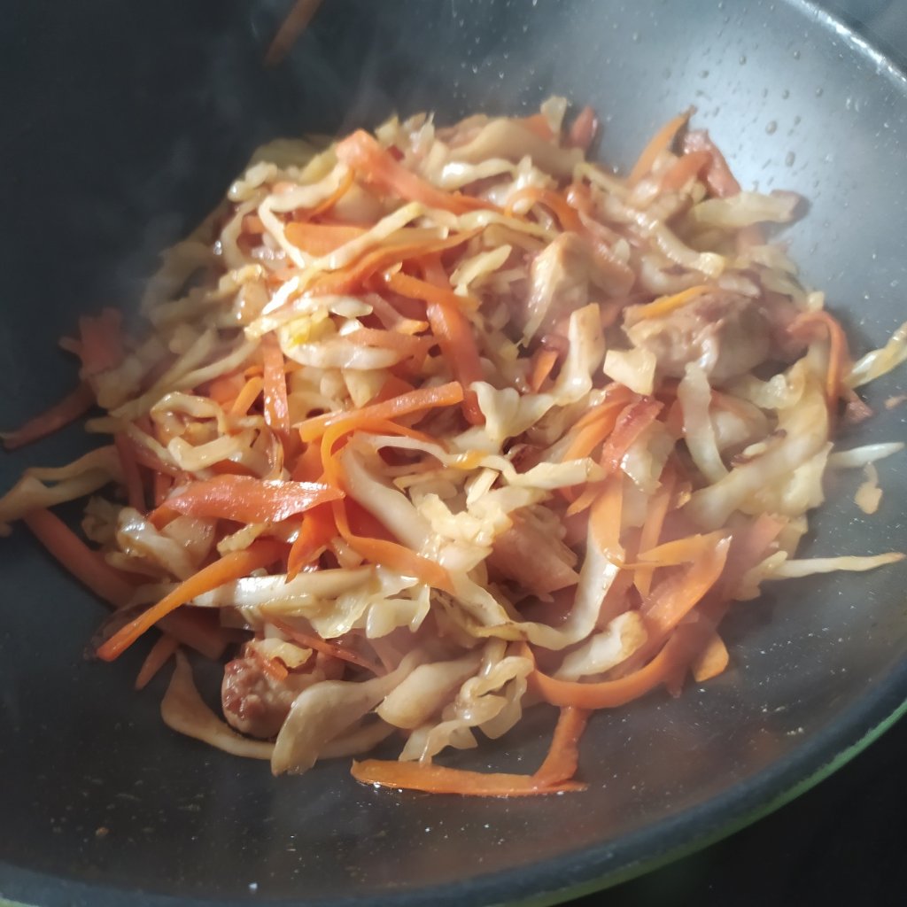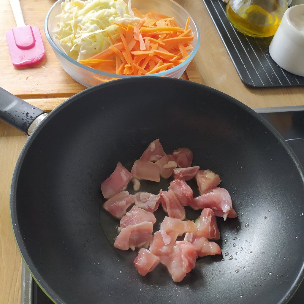 - En una sartén grande o en un wok añadimos un poco de aceite, calentamos y, con el fuego fuerte, agregamos el pollo con 1 cucharada de salsa de soja y sofreímos hasta que cambie de color. Después echamos las tiras de zanahoria y de repollo y el jengibre. Salteamos durante 5 minutos con el fuego fuerte y sin dejar de remover.