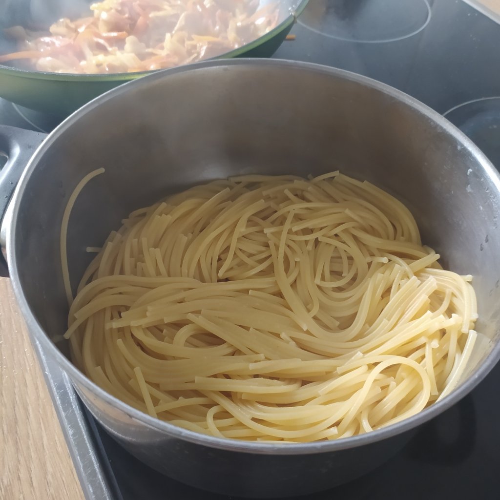 - En una cazuela echamos agua y cuando comience a hervir introducimos los espaguetis y los cocinamos el tiempo que se indique en el envase, escurrimos y reservamos.